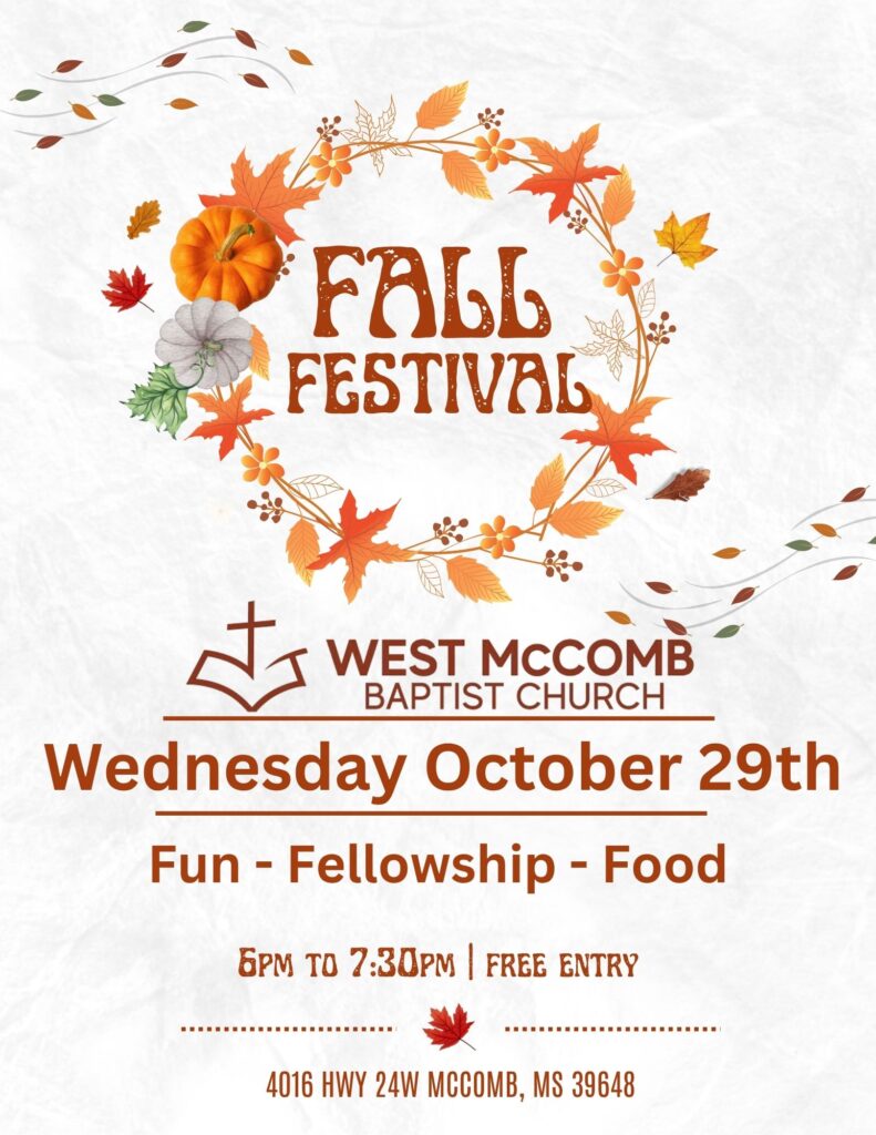 West McComb Baptist Church will host its annual Fall Festival on October 29th from 6:00pm to 7:30pm in the back parking lot by the Bus Barn. Food will be provided along with several games, activities, and entertainment. All ages are invited to join this evening of celebration for all that God has done in our lives through Creation. For more information contact Ms. Julie at children@westmccombbaptist.com or call our church office at (601)-684-5442